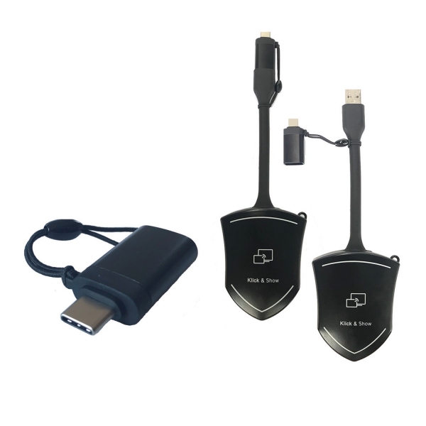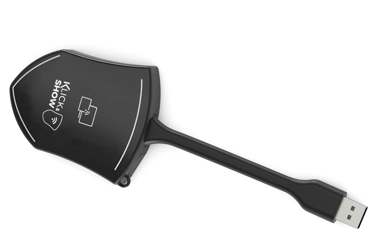 Der Klick & Show TOUCH Transmitter ist ein kompakter WLAN-Sender im eleganten Design eines intuitiv bedienbaren, berührungsempfindlichen Dongles, der per USB-Anschluss mit dem Laptop verbunden wird.